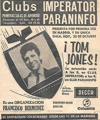 Creo que fue en 1972 cuando Tom Jones visitó Madrid para presentar un nuevo disco y dos conciertos en las madrileñas salas Imperator y Paraninfo. Tuve ocasión de verle actuar en directo en la primera sala. Ni que decir tiene que los dos famosos locales se llenaron completamente, especialmente de mujeres de todas las edades.